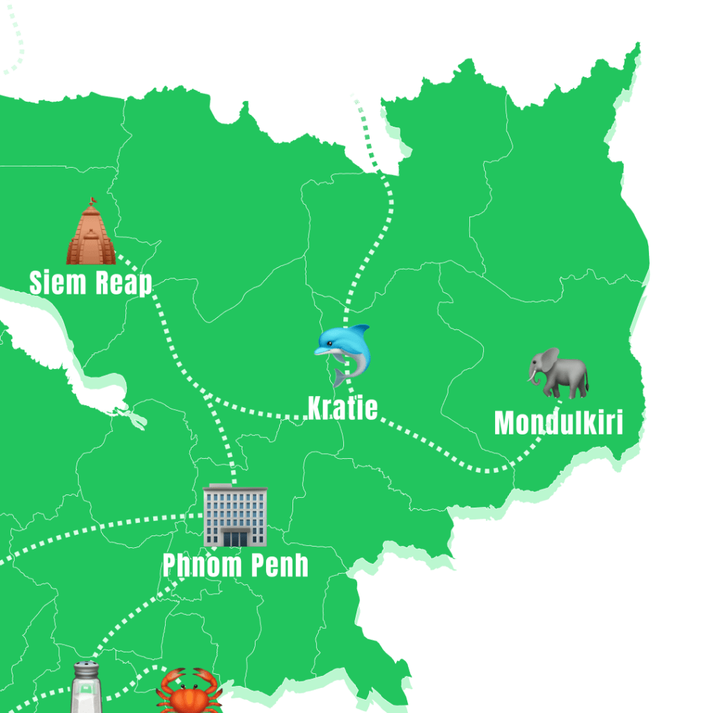Passage frontière Laos-Cambodge : 2$ à payer côté Laos + visa 35$ côté Cambodge (pour les Français). De Don Det à Kratie : Environ 6-7h (depart 9h, arrivée 16h) avec le passage de la frontière, l’attente d’un nouveau mini van, 30-40min pour déjeuner, etc. Prix total des transports : 24$/pers