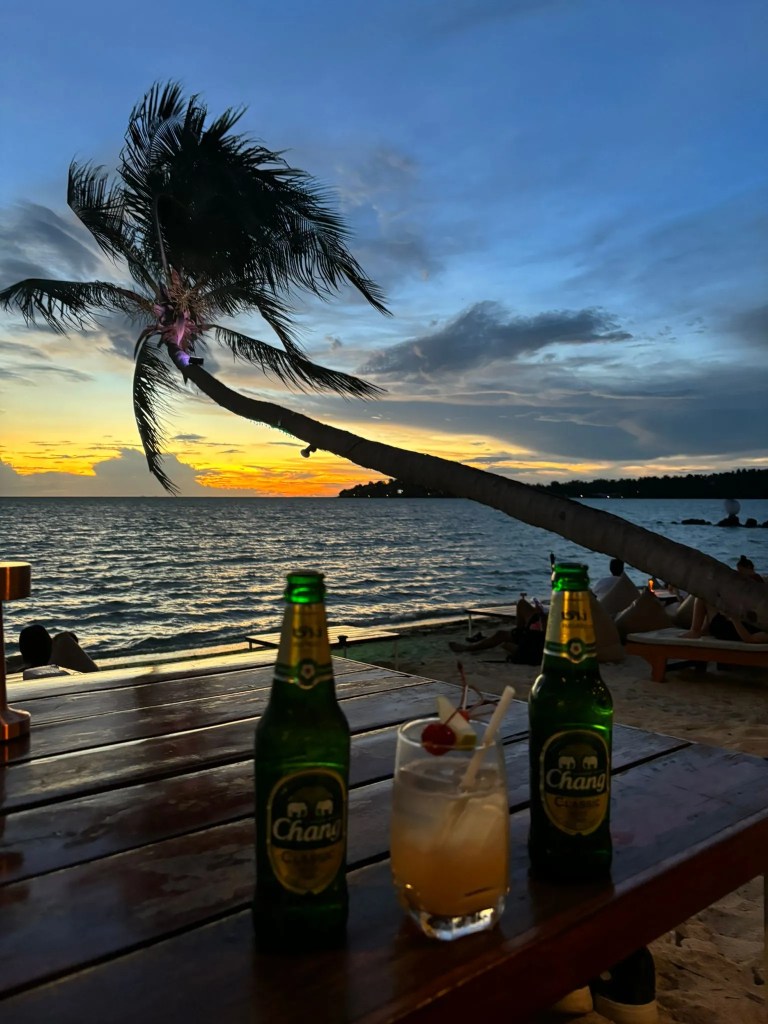 Magnifique coucher de soleil. Vous pouvez vous poser sur la plage ou sur un des beach bars. Après le coucher de soleil, on peut assister à des spectacles de cracheurs de feu.