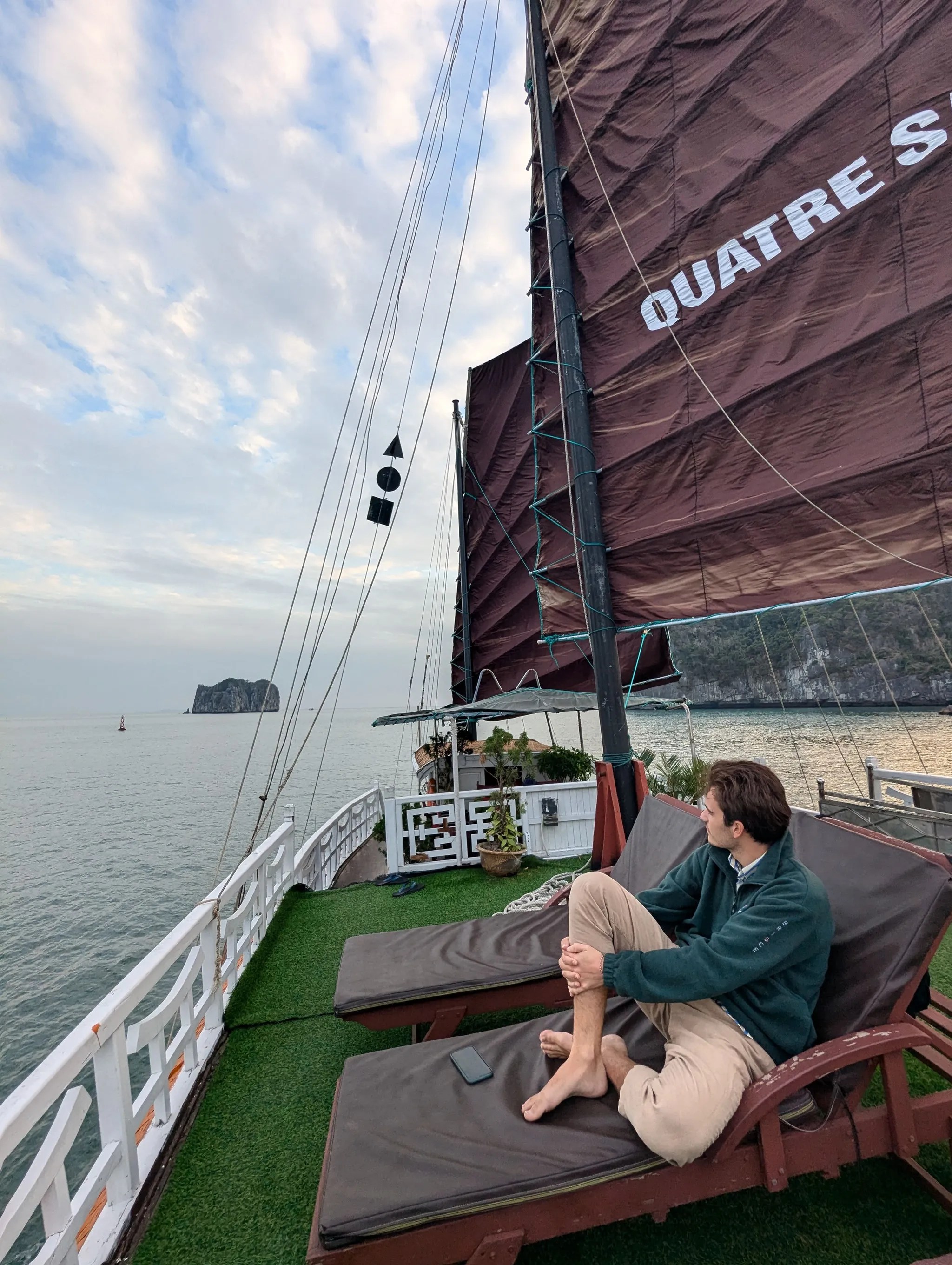 ⛵ Croisière sur une jonque en bois traditionnelle avec seulement 4 cabines à bord (8 personnes max). Superbe terrasse, avec transats, sur laquelle on peut prendre nos repas. Les chambres sont spacieuses avec salle de bain privée. Le staff est sympathique, il y’a une guide francophone avec nous à bord. Les repas sont bons et en grande quantité !